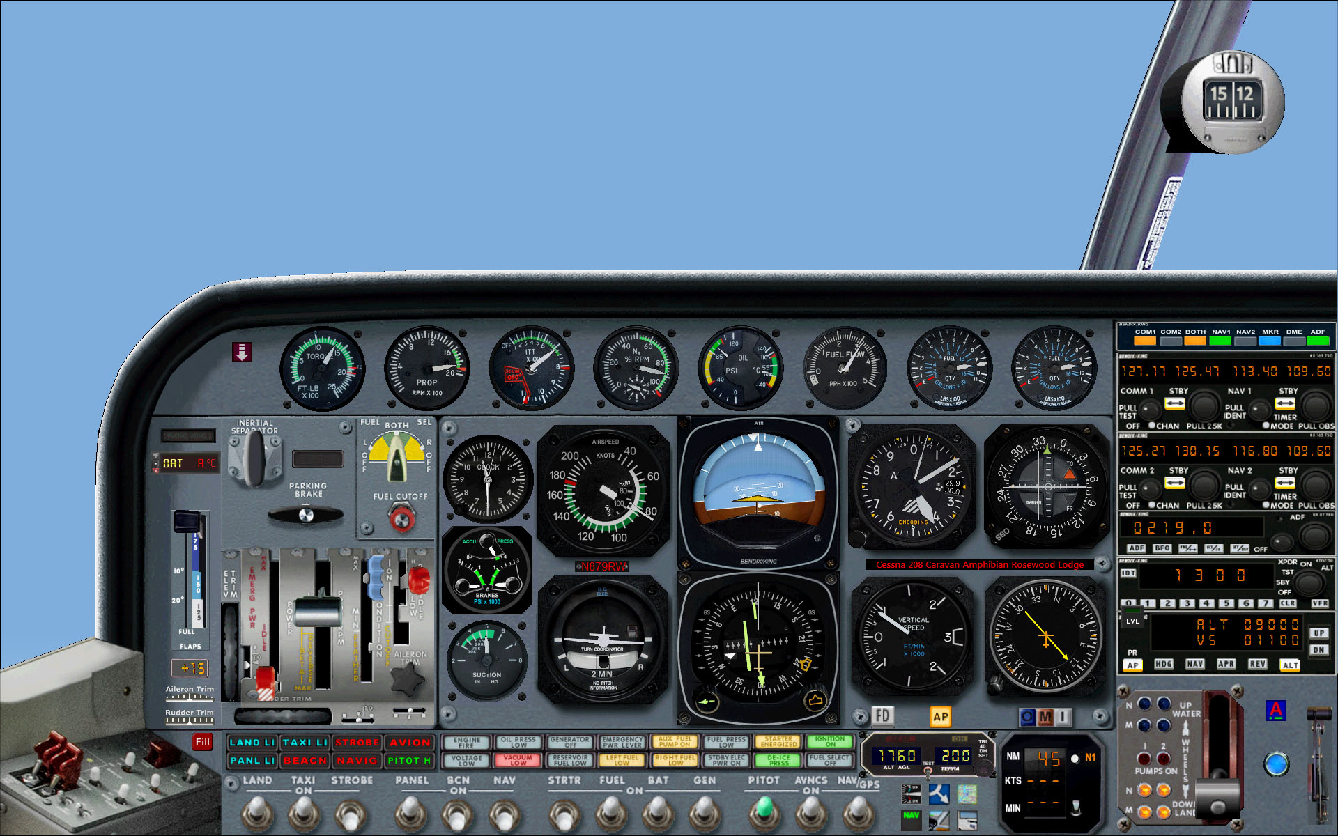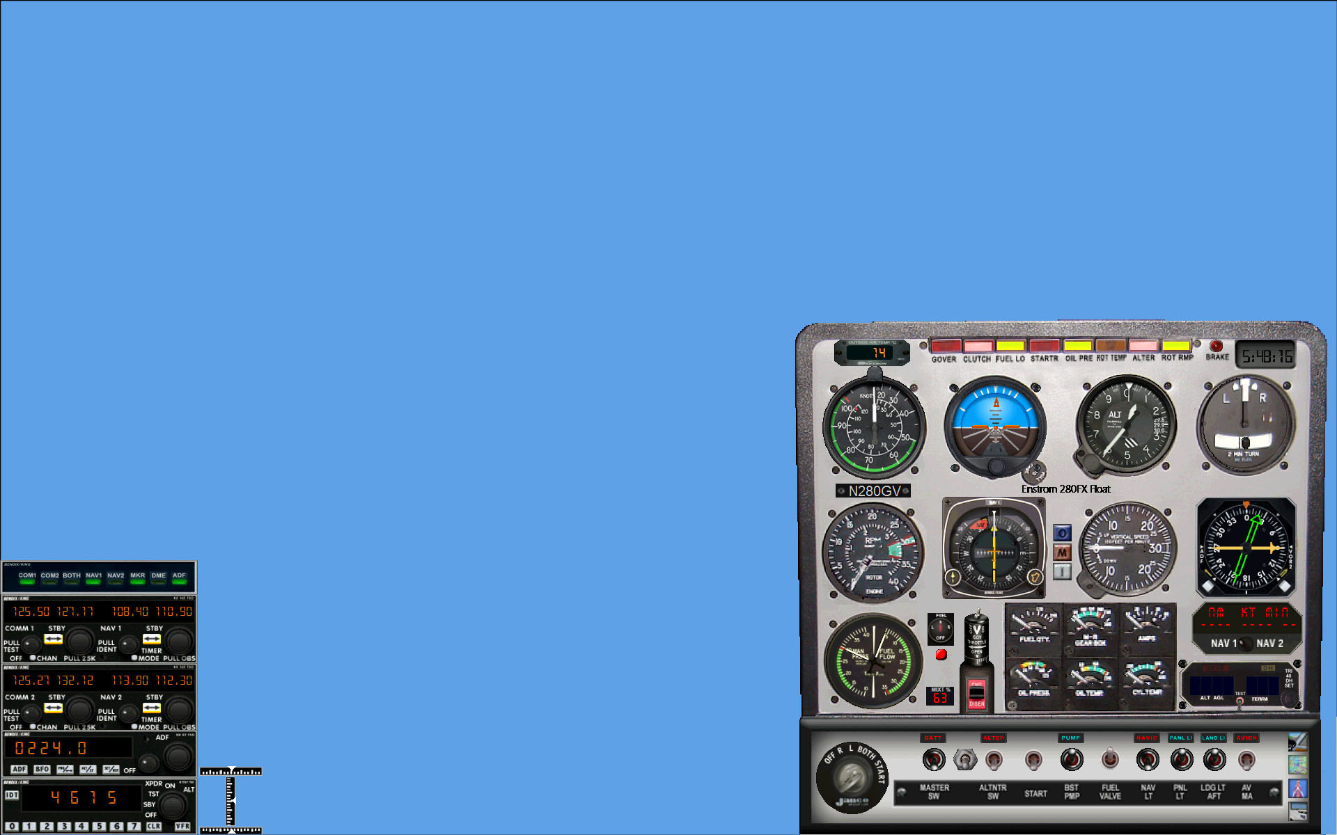 I eventually produced a full set of "Cloudy's Rational Panels for FS2004": they only have additional "windows" for the GPS and for a few non-essential overhead panels and calculators. A few of my panels show minor-scale reworkings, but most of them are full redesigns. My only unrealistic additions are the digital Mixture and Elevator-Trim gauges, which however I find a necessity in a PC simulation, as well as a gauge that simply shows which livery one is flying. Please find below screenshots of my panels, which I keep updated. Please feel free to download the images: they show below in resolution 1280x800 but will download at their full resolution of 1920x1200.